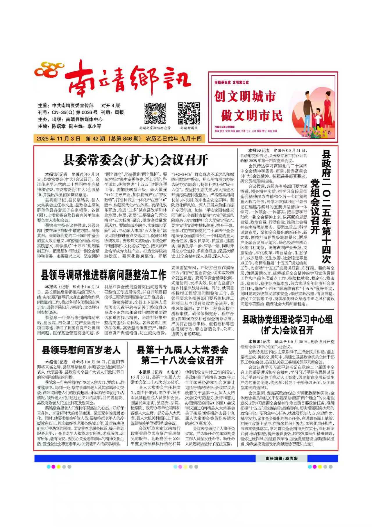 11月10日,县委“一周一主题”解难题日活动暨“十五五”规划编制工作专题会召开,会议深入学习贯彻党的二十届四中全会精神,全面落实国家战略部署和省、市工作要求,听取我县“十五五”规划编制工作情况汇报,进一步集思广益,全力推进规划编制工作走深走实,为南靖“十五五”发展筑牢战略根基。县委副书记、县长蔡铭泉,县人大常委会主任林文生,县政协主席陈群伟等县领导,各镇(园)、土楼管委会党政主要领导、县直有关单位主要负责人,北京政达数通咨询有限公司专家及相关人员参加会议。[详细]