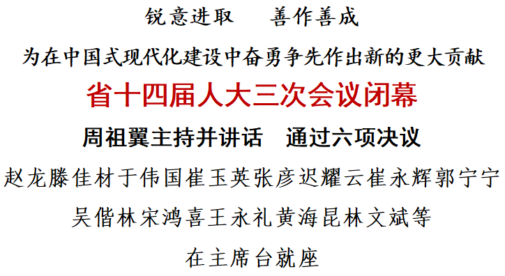 省十四届人大三次会议圆满完成各项议程,于1月17日下午在福建会堂闭幕。 大会主席团常务主席、执行主席周祖翼主持会议并讲话。周祖翼强调,全省上下要更加紧密地团结在以习近平同志为核心的党中央周围,深入贯彻落实习近平总书记重要讲话重要指示批示精神,扭住目标不放松,一张蓝图绘到底,锐意进取、善作善成,为在中国式现代化建设中奋勇争先作出新的更大贡献。 担任闭幕会执行主席的是:周祖翼、周联清、陈冬、庄稼汉、林宝金、李德金、檀云坤、袁毅、黄新銮。 省长赵龙,省政协主席滕佳材,全国人大、全国政协专委会领导于伟国、崔玉英,省领导张彦、迟耀云、崔永辉、郭宁宁、吴偕林、宋鸿喜、王永礼、黄海昆、林文斌等在主席台就座。 福建省第十四届人民代表大会实有代表559人,出席本次大会的代表539人,符合法定人数。 大会表决通过《关于福建省人民政府工作报告的决议》《关于福建省2024年国民经济和社会发展计划执行情况与2025年国民经济和社会发展计划的决议》《关于福建省2024年预算执行情况与2025年预算的决议》《关于福建省人民代表大会常务委员会工作报告的决议》《关于福建省高级人民法院工作报告的决议》《关于福建省人民检察院工作报告的决议》。 随后,大会举行宪法宣誓仪式。本次大会选举的省人大常委会委员进行了宣誓。