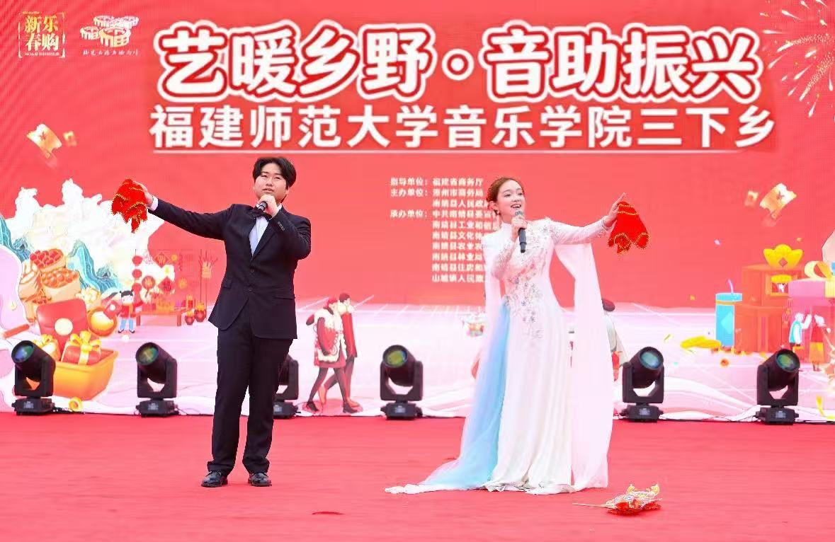 南靖新闻网2月14日讯(福师大音韵同心实践队 本中心综合)春节将至,年味渐浓,广大返乡大学生充分利用寒假时机积极投身社会实践,用青春行动服务家乡建设,成为今年假日里一道亮丽的风景线。 在“全闽乐购· 好物南靖”2026年首届五福南靖年货嘉年华火热举办之际,福建师范大学音乐学院“音韵同心”实践队的返乡大学生们走进南靖江滨公园,开展“艺暖乡野 音助振兴”寒假社会实践主题活动,以艺术为媒、以青春为笔,为新春南靖增添别样色彩。