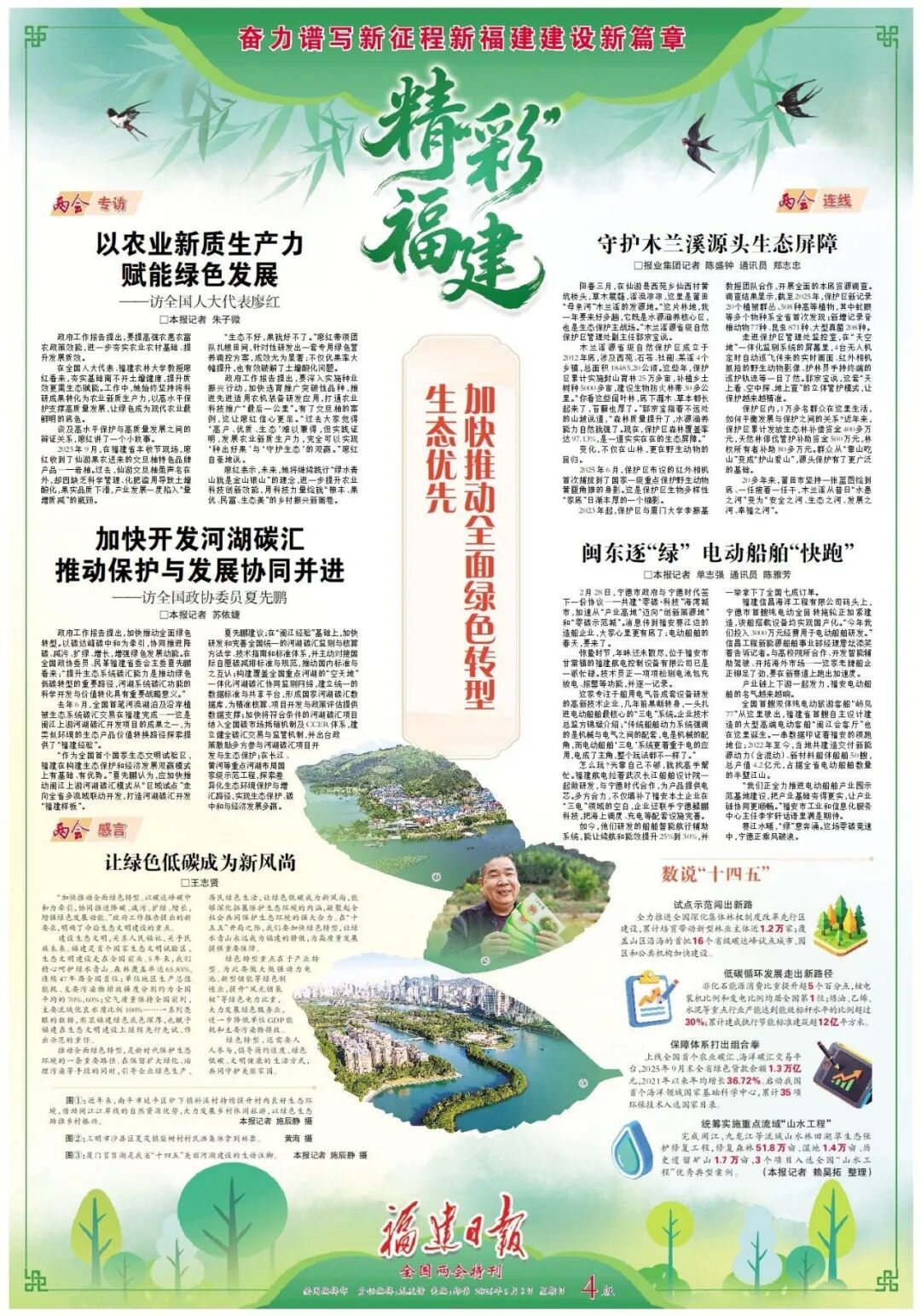《福建日报》2026年3月8日第04版 生态优先,加快推动全面绿色转型 两会专访 以农业新质生产力赋能绿色发展——访全国人大代表廖红 政府工作报告提出,要提高强农惠农富农政策效能,进一步夯实农业农村基础、提升发展质效。在全国人大代表、福建农林大学教授廖红看来,夯实基础离不开土壤健康,提升质效更需生态赋能。工作中,她始终坚持将科研成果转化为农业新质生产力,以高水平保护支撑高质量发展,让绿色成为现代农业最鲜明的底色。 加快开发河湖碳汇推动保护与发展协同并进——访全国政协委员夏先鹏 政府工作报告提出,加快推动全面绿色转型。以碳达峰碳中和为牵引,协同推进降碳、减污、扩绿、增长,增强绿色发展动能。在全国政协委员、民革福建省委会主委夏先鹏看来:“提升生态系统碳汇能力是推动绿色低碳转型的重要路径,河湖系统碳汇功能的科学开发与价值转化具有重要战略意义。”