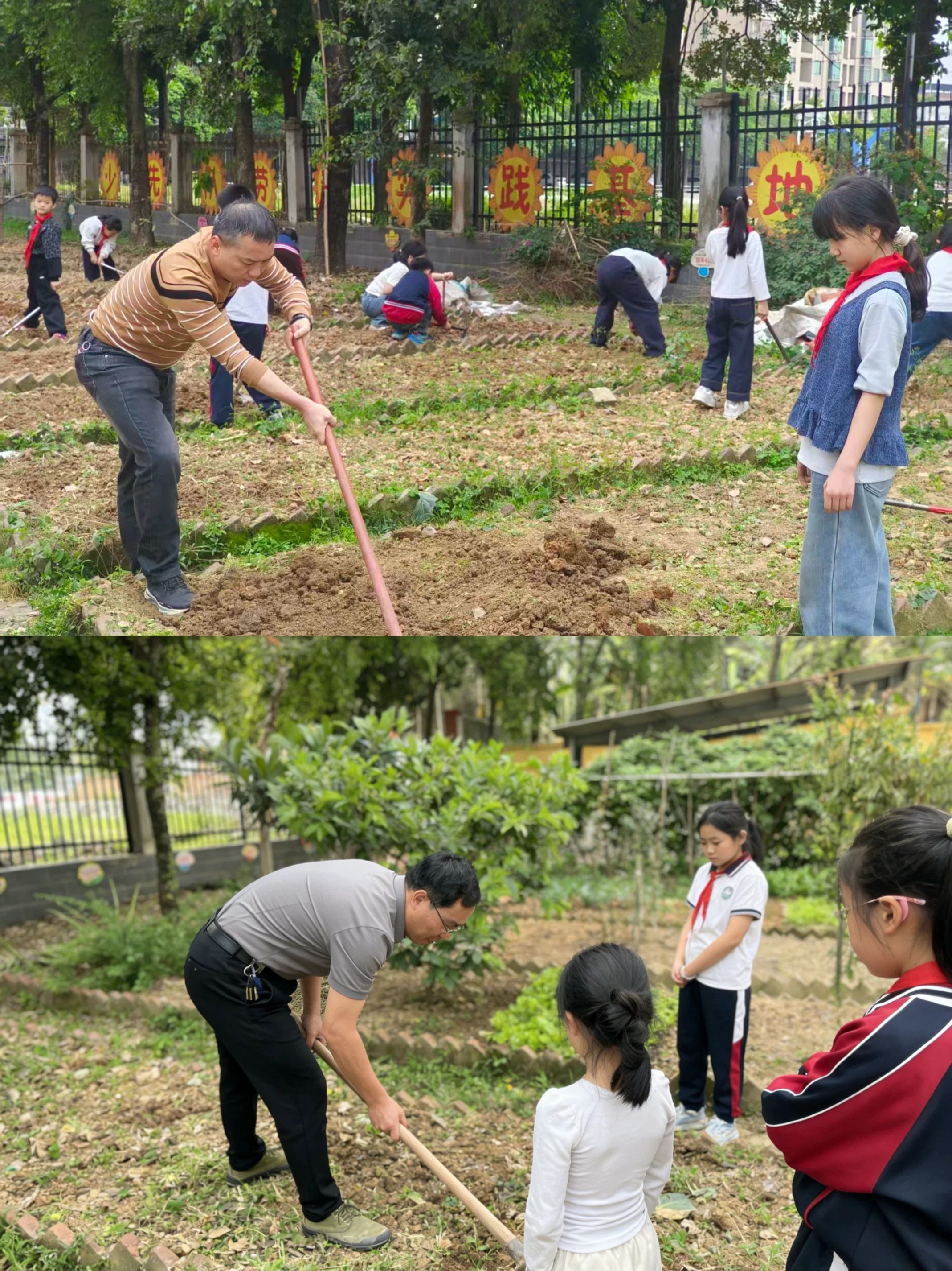活动中,党员教师率先垂范、全员并肩劳作,以实际行动发挥先锋模范作用。师生分工协作,除草、运肥、整地,现场热火朝天,尽显吃苦耐劳的优良作风。